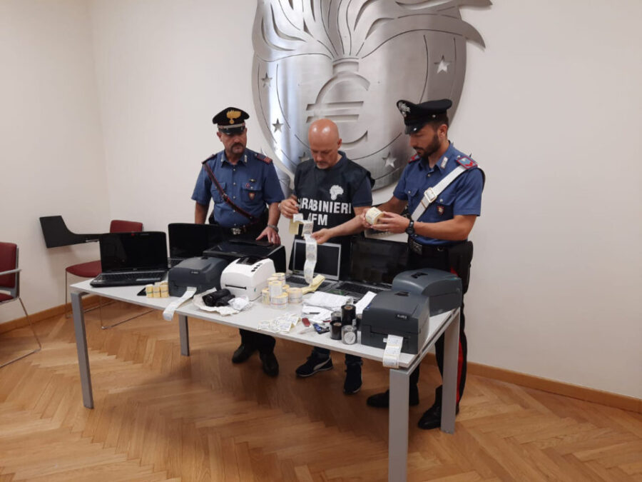 Nella perquisizione eseguita nella fragranza presso l’abitazione dello stesso, sita in villa Literno via Santa Maria Cubito s.n.c., i militari rinvenivano, all’interno di una delle stanze, una vera e propria stamperia operativa, attrezzata con 5 stampanti termiche e materiale hardware e software dedicato, che consentivano al falsario di personalizzare la stampa delle marche di bollo in bianco, confezionate in bobinotti di probabile origine cinese (come attestato da analoghe operazioni del Comando specializzato dell’Arma nello specifico settore).