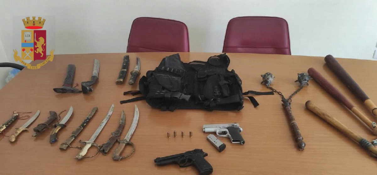 Inoltre, presso l’abitazione del giovane sono stati rinvenuti 2 spade giapponesi tipo “katana”, 3 pugnali, un machete, 3 mazze da baseball, un manico in legno con due palle chiodate e, occultata in un armadio, una pistola calibro 45, con matricola abrasa, caricata con 4 cartucce.