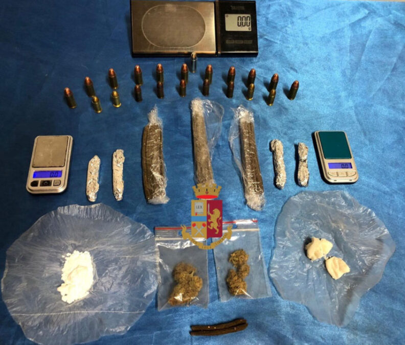 Inoltre, gli agenti hanno eseguito un controllo ad alcuni edifici dell’area e hanno sequestrato 21 cartucce di vario calibro, 2 bustine contenenti marijuana per un peso complessivo di circa 3 grammi, 7 involucri contenenti hashish per un peso complessivo di circa 39 grammi, un involucro contenente cocaina per un peso di 4 grammi, un involucro contenente crack per un peso complessivo di circa 7 grammi e 3 bilancini elettronici di precisione.