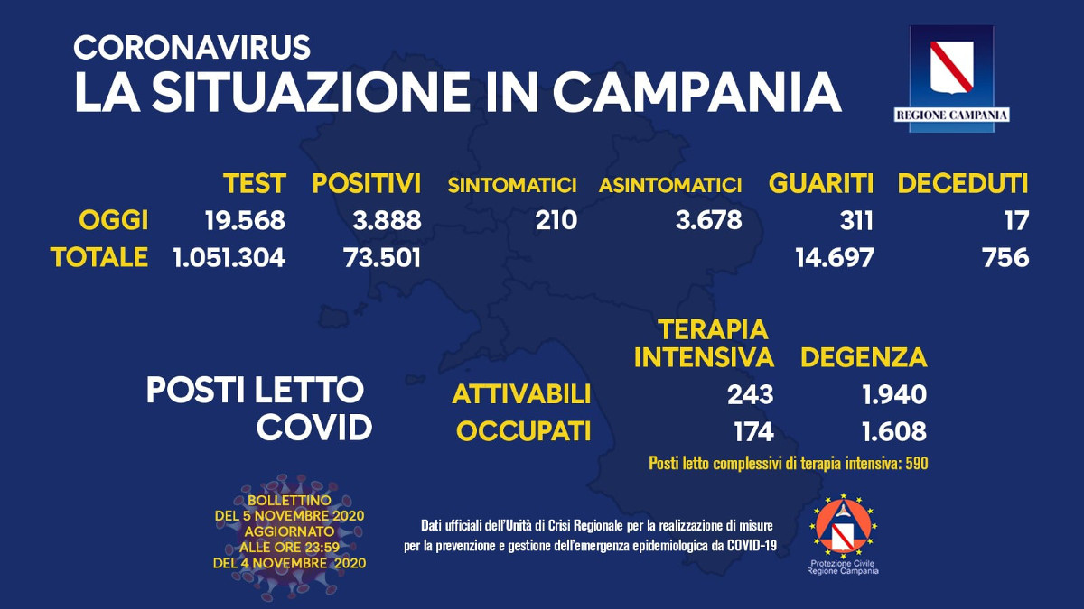 Nel bollettino diramato su facebook da De Luca si legge che su 19.568 tamponi effettuati in un giorno sono risultati 3.888 positivi
