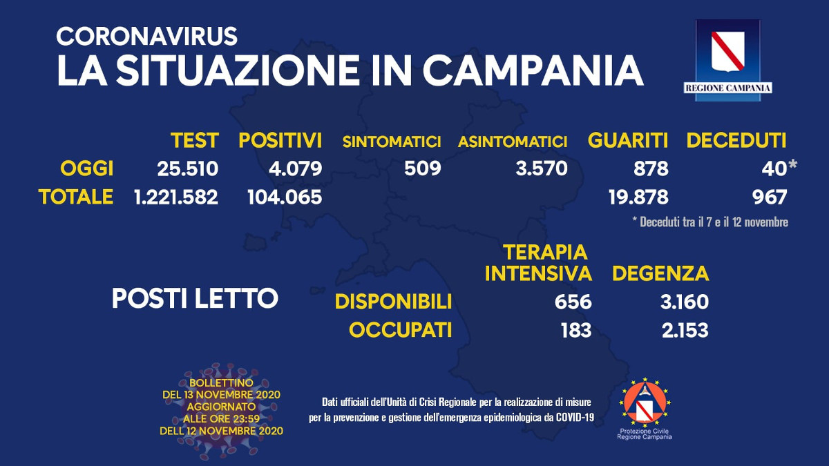 Nel bollettino diramato su facebook da De Luca si legge che su 25.510 tamponi effettuati in un giorno sono risultati 4.079 positivi di cui 3.570 sono asintomatici e 509 sono sintomatici.