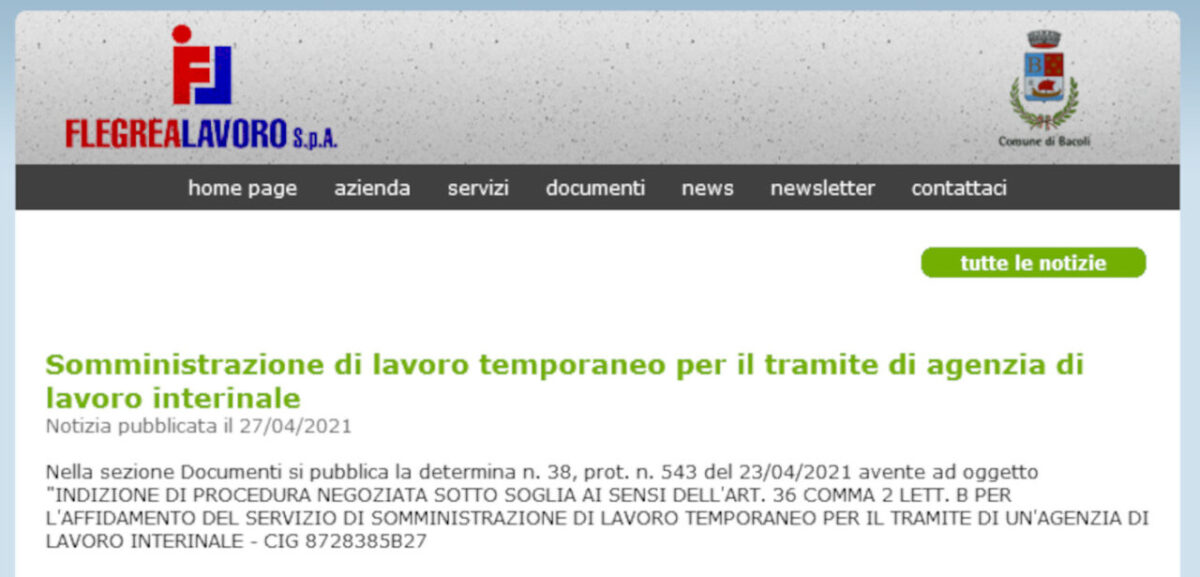 La determina – n. 38 solo adesso pubblicata – indice “procedura per l’affidamento del servizio di somministrazione di lavoro temporaneo tramite agenzia di lavoro interinale”.