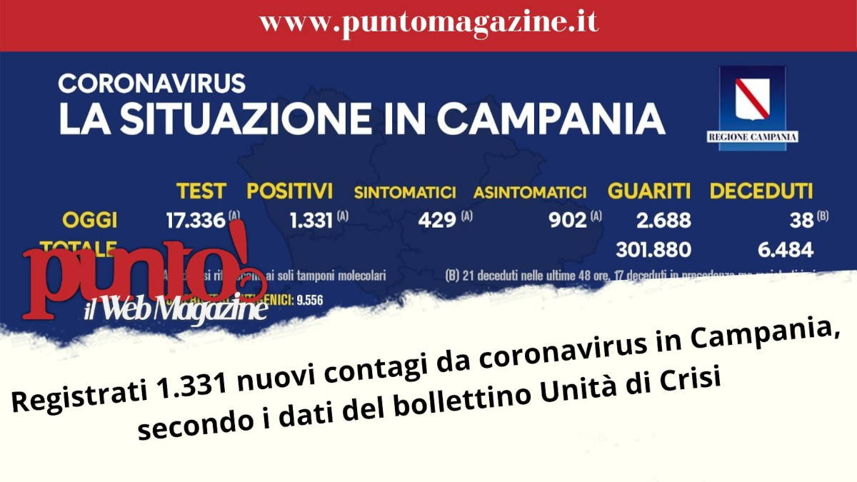 Oggi sono stati registrati 1.331 nuovi contagi da coronavirus in Campania, secondo i dati del bollettino Unità di Crisi. Nella tabella 38 morti: 21 deceduti nelle ultime 48 ore, 17 deceduti in precedenza ma registrati ieri.