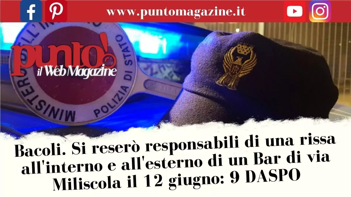 Il Questore di Napoli ha emesso 9 provvedimenti di Divieto di accesso ai pubblici esercizi o locali di pubblico trattenimento ex art. 13bis del D.L. 14/2017, come modificato dal D.L. 130/2020, nei confronti di 9 persone tra i 16 e i 22 anni originarie di Pozzuoli, Bacoli e Napoli, che lo scorso 12 giugno si erano rese responsabili di una rissa aggravata scaturita all’interno e all’esterno di un bar in via Miliscola a Bacoli.