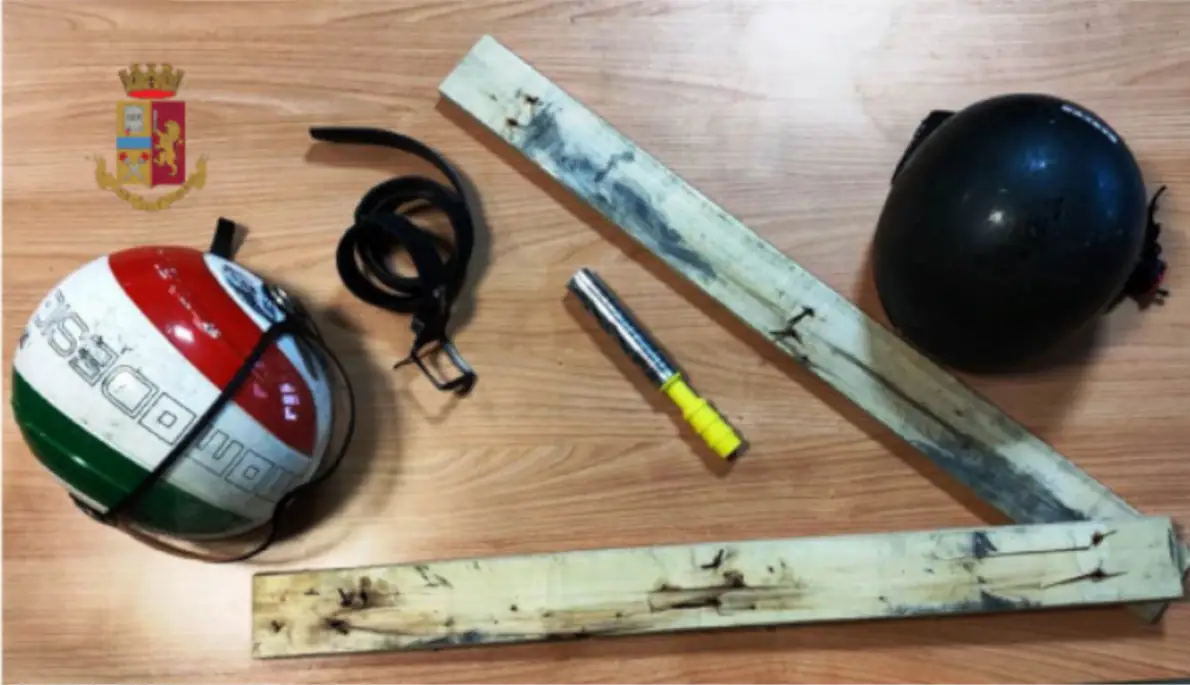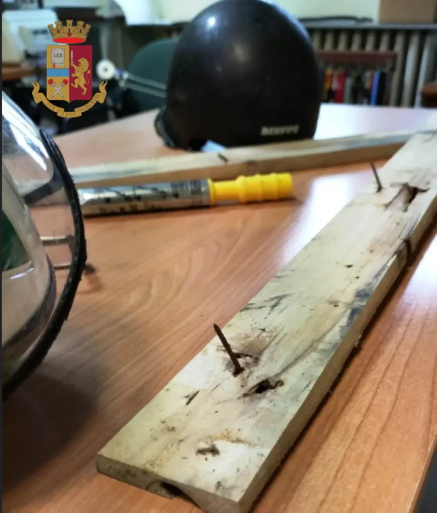 Particolare di un bastone chiodato e di un casco, il tutto sequestrato dalla Polizia