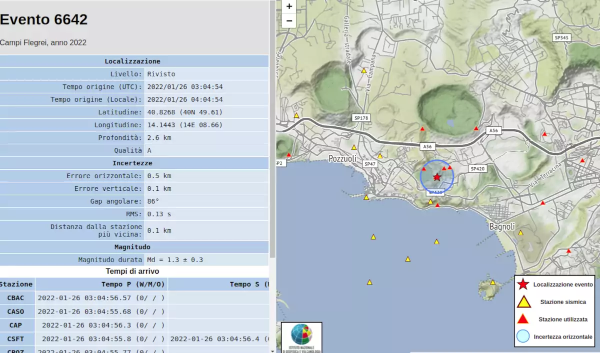 Alle ore 7:53 è stata dichiarata la fine dello sciame costituito in totale da 29 terremoti di magnitudo compresa tra 0.3 e 1.3 ± 0.3. L’evento sismico più significativo (magnitudo M=1,3± 0,3) si è prodotto alle 03:04, alla profondità di 2,6 km in prossimità del cratere della Solfatara.