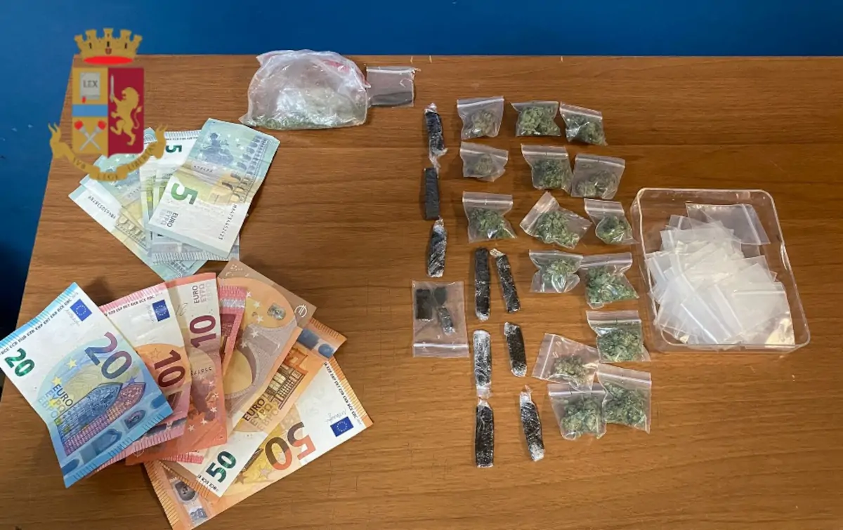 Il ragazzo, accortosi della presenza dei poliziotti, per guadagnare la fuga li ha spintonati fino a quando. Gli agenti con difficoltà lo hanno bloccato e lo hanno trovato trovato in possesso di 15 bustine contenenti marijuana del peso di circa 16 grammi, una busta con circa 2 grammi della stessa sostanza, 11 stecche di hashish per circa 16 grammi, diverso materiale per il confezionamento della droga e 230 euro.