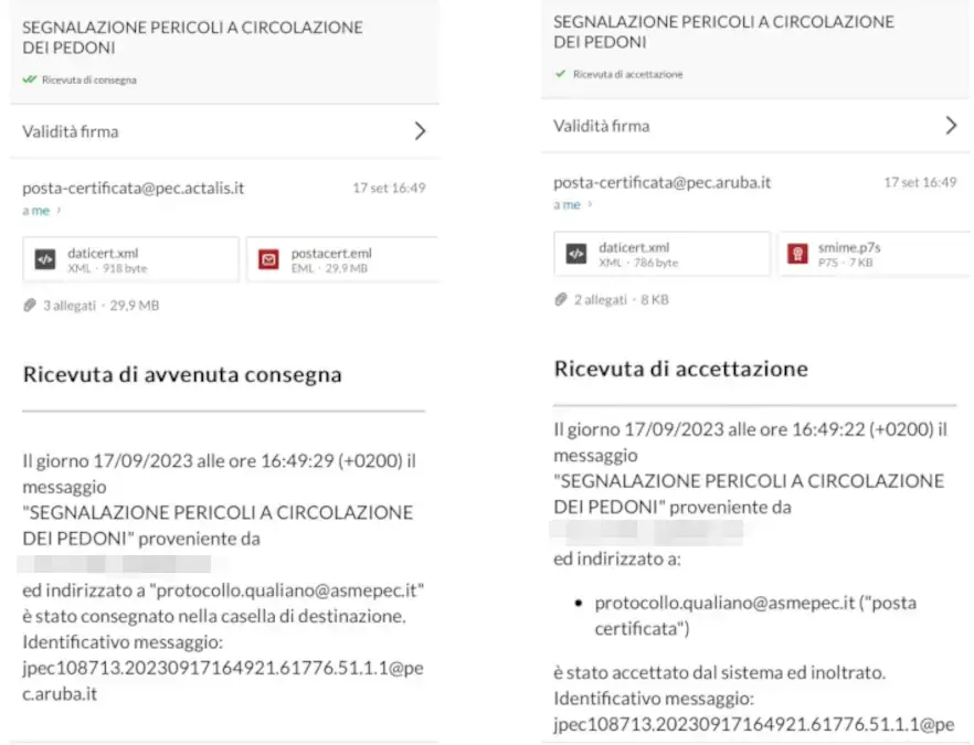 Il lettore ci ha anche segnalato del fatto che ha inviato una Pec al comune per metterli a conoscenza di questi pericoli, ma quest’ultima risulta consegnata ma non protocollata.