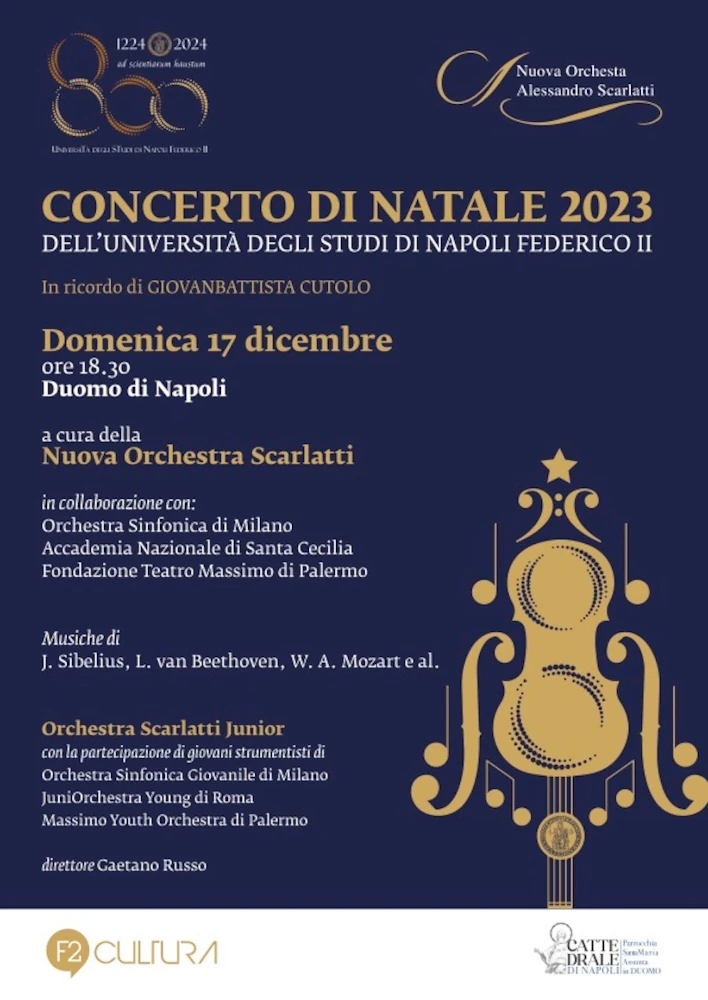 Domenica 17 dicembre alle ore 18.30 nel Duomo di Napoli (Via Duomo 147) circa 100 ragazze e ragazzi dell’Orchestra Scarlatti Junior, cuore giovane della Comunità di Orchestre cresciuta intorno alla Nuova Orchestra Scarlatti, saranno protagonisti del Concerto di Natale 2023 dell’Università Federico II, uno degli eventi inaugurali, a ingresso gratuito, del ciclo di celebrazioni per gli 800 anni della Federico II (2023/24) che, inquadrandosi nella partnership organica fra l’Ateneo Federiciano e la N.O.S. per promuovere formazione, cultura, futuro, in particolare per i giovani, non poteva non essere dedicato alla memoria di Giovanbattista Cutolo, giovane musicista napoletano cresciuto nelle file della Scarlatti Junior, stroncato da una violenza barbara e senza senso.