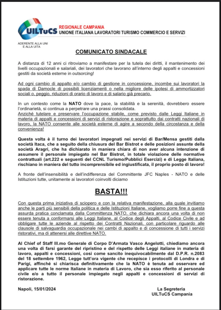 “A distanza di 12 anni ci ritroviamo a manifestare per la tutela dei diritti, il mantenimento dei livelli occupazionali e salariali, dei lavoratori che lavorano all’interno degli appalti e concessioni gestiti da società esterne in outsorcing! Ad ogni cambio di appalto e/o cambio di gestione in concessione, incombe sui lavoratori la spada di Damocle di possibili licenziamenti o nella migliore delle ipotesi di ammortizzatori sociali o, peggio, riduzioni di orario di lavoro e di salario già precario. In un contesto come la NATO dove la pace, la stabilità e la serenità, dovrebbero essere l’ordinarietà, si continua a perpetrare una prassi consolidata. Anziché tutelare e preservare l’occupazione stabile, come previsto dalle Leggi Italiane in materia di appalti e concessioni di servizi di ristorazione e soprattutto dai contratti nazionali di lavoro, la NATO consente alle società esterne di agire a secondo della circostanza e della convenienza! Questa volta è il turno dei lavoratori impegnati nei servizi di Bar/Mensa gestiti dalla società Itaca, che a seguito della chiusura del Bar Bistrot e delle posizioni assunte della società Aragri, che ha dichiarato in maniera chiara di non aver alcuna intenzione di assumere il personale impiegato nel Bar Bistrot, in totale violazione delle normative contrattuali (art.222 e seguenti del CCNL Turismo/Pubblici Esercizi) e di Legge Italiana, rischiano in maniera del tutto incomprensibile ed ingiustificata, il proprio posto di lavoro! A fronte dell’insensibilità e dell’indifferenza del Committente JFC Naples – NATO e delle Istituzioni tutte, unitamente ai lavoratori coinvolti diciamo BASTA!!!