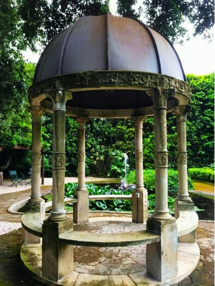 Una quercia maestosa, un albero di canfora, naturale e potentissimo “profumatore d’ambiente”, e camelie centenarie (tra cui spicca una rarissima varietà di colore viola), si accompagnano allo scenografico “Viale degli Ombrellini”, esercizio di arte topiaria settecentesca e ad una vasca con papiri e ninfee, posizionata accanto ad una sorta di piccola serra affrescata.