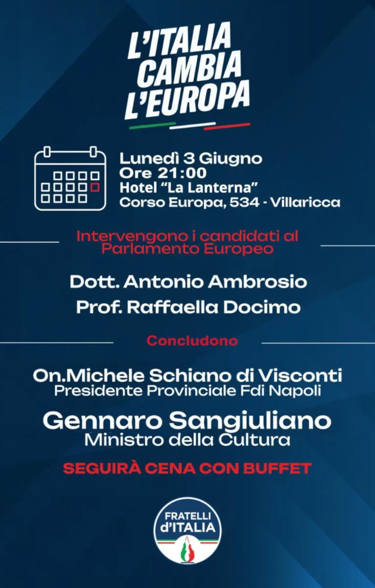 L’evento è stato organizzato dal Coordinamento Cittadino di Fratelli d’Italia Villaricca il quale ha voluto fortemente questo incontro in occasione delle Elezioni Europee che si svolgeranno i giorni 8 e 9 giugno prossimo. Saranno presenti anche l’On. Michele Schiano di Visconti in qualità di Presidente Provinciale di Fratelli d’Italia e i candidati alle elezioni europee dott. Antonio Ambrosio e prof.ssa Raffaella Docimo.