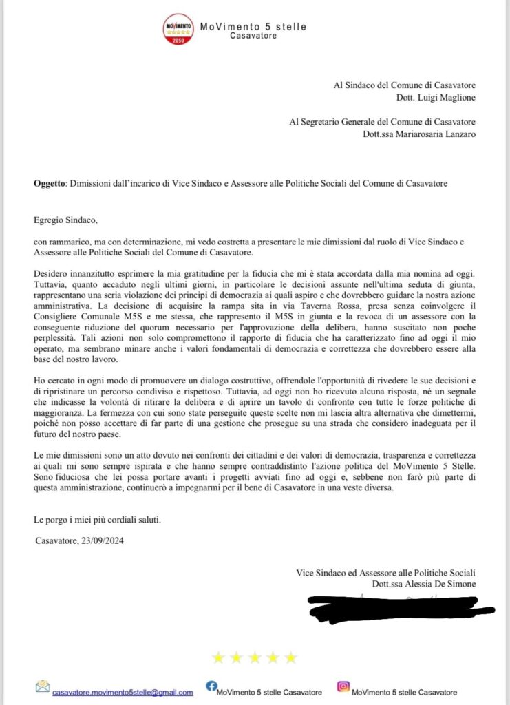 Le dimissioni della Dott.ssa De Simone rappresentano un gesto di responsabilità verso i cittadini, in difesa dei valori di democrazia, trasparenza e correttezza che hanno sempre ispirato il nostro operato, unitamente ai valori fondati del M5S.