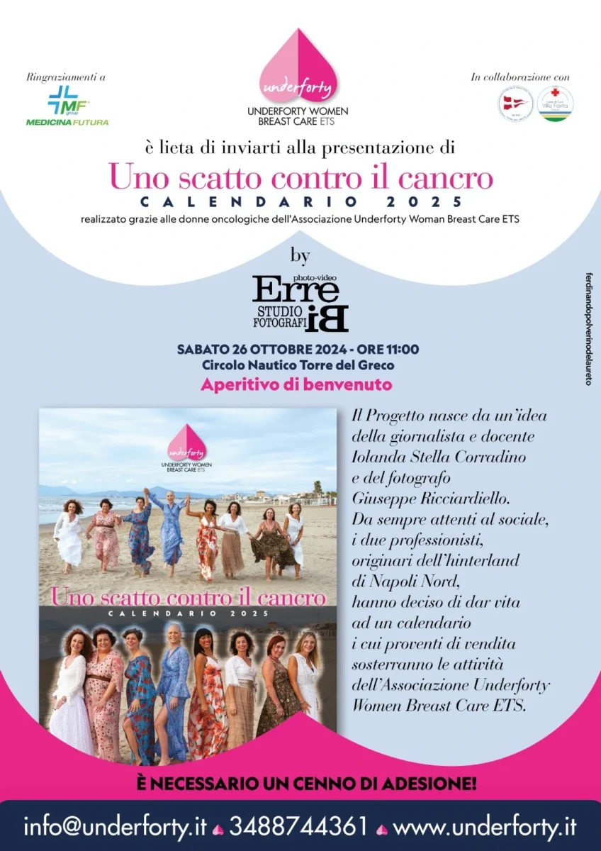 L’Associazione è presieduta dalla Sig.ra Maria Conte e dal Direttore Scientifico, il Dr. Massimiliano D’Aiuto, chirurgo, oncologo, senologo L’Underforty si occupa di prevenzione senologica, counseling psicologico, educazione sanitaria, caregiving oncologico, supporto alla ricerca, foundraising e crowdfunding. Il calendario sarà presentato nel mese di ottobre, notoriamente dedicato a sostenere la ricerca contro il tumore al seno, in una splendida location fornita dall’Associazione Underforty. Siamo certi vi sarà una grande partecipazione all’evento, così come alla diffusione del calendario e del messaggio che esso rappresenta.