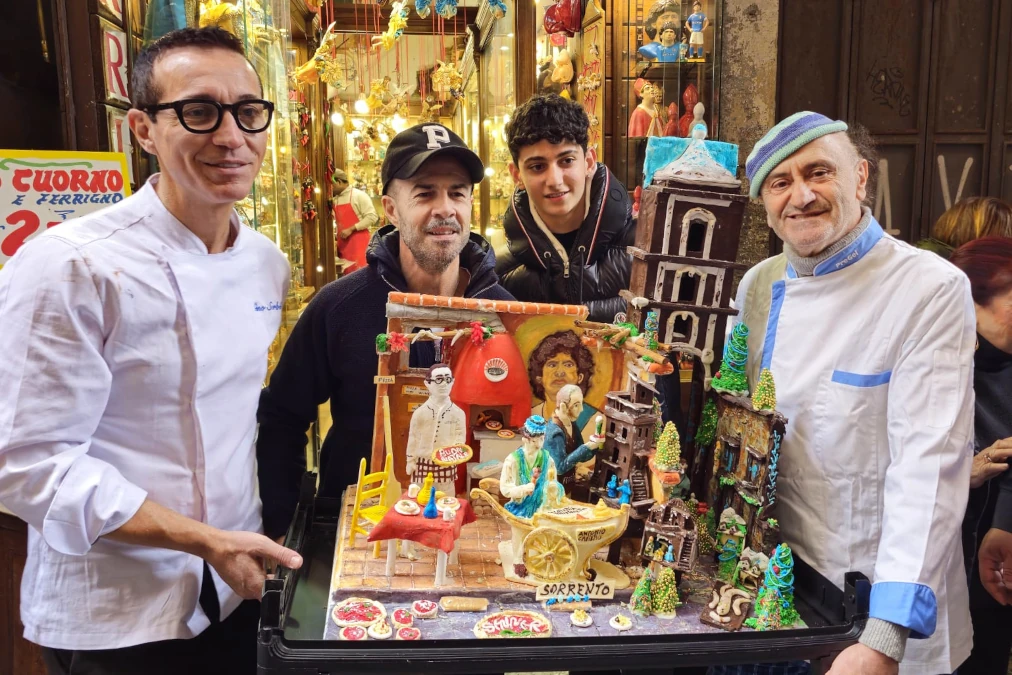 A creare, per l’occasione la sua gustosa statuetta, plasmata in cioccolato e zucchero, il pasticciere sorrentino delle celebrity Antonio Cafiero, che sul suo stuzzicante presepe – del peso di oltre 70 chili – ha posizionato anche sé stesso e il noto pizzaiolo partenopeo, Gino Sorbillo. Uno scenario insolito, con tanto di antico campanile sullo sfondo, che vede il primo, tra le sue creature, suggestive Natività e alberelli illuminati; Sorbillo, nella sua pizzeria e Cafiero accanto al carrettino col quale il padre girava per le vie di Sorrento intorno agli anni Quaranta dispensando gelati e castagnacci.