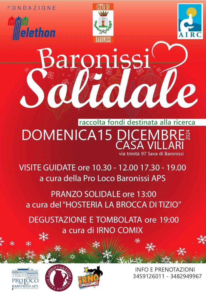 Baronissi si unisce per una nobile causa: domenica 15 dicembre 2024, Casa Villari ospiterà “Baronissi Solidale”, una giornata interamente dedicata alla condivisione e alla solidarietà, con l’obiettivo di raccogliere fondi per sostenere la ricerca scientifica sulle malattie rare e quella contro il cancro. Un appuntamento che unisce cultura, gastronomia e intrattenimento per ricordarci che ogni gesto di generosità può fare la differenza. L’iniziativa – promossa in collaborazione con la Fondazione Telethon, l’AIRC, con l’adesione della Pro Loco Baronissi APS, l’Hosteria “La Brocca di Tizio” e Irno Comix – si snoderà attraverso una serie di attività aperte a tutta la comunità. Dalle visite guidate organizzate dalla Pro Loco Baronissi APS (10:30-12:00 e 17:30-19:00) al pranzo solidale delle 13:00 a cura dell’Hosteria “La Brocca di Tizio”, fino alla tombolata serale con degustazioni alle 19:00 in compagnia di Irno Comix, ogni momento sarà pensato per promuovere la solidarietà e il sostegno alla ricerca.