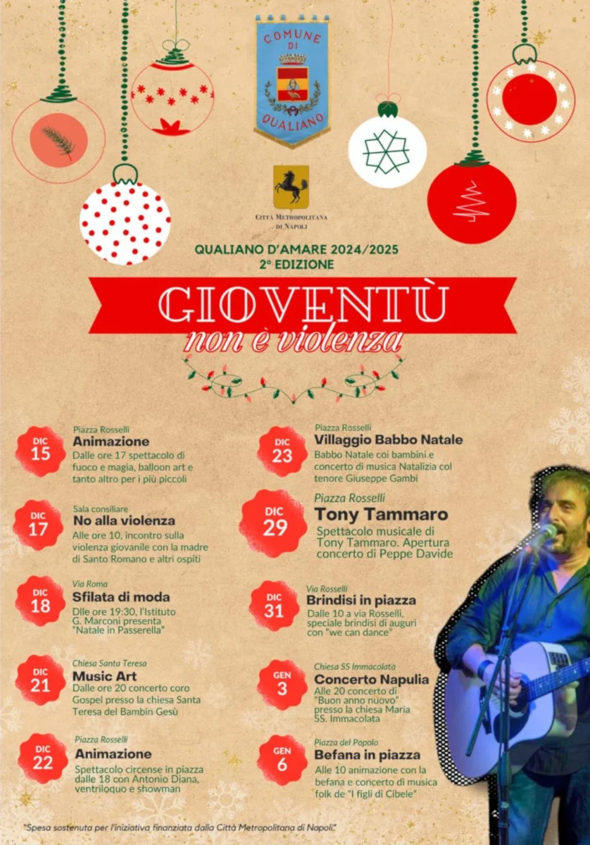 Il Comune di Qualiano, in collaborazione con la Città Metropolitana di Napoli, è lieto di presentare il calendario degli eventi natalizi 2024/2025, giunti alla seconda edizione del progetto Qualiano d’Amare.