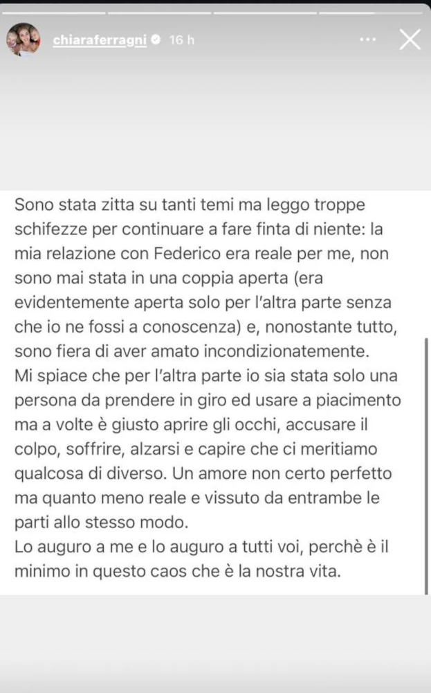 Nonostante il dolore, Ferragni ha concluso il suo lungo sfogo con un messaggio di speranza: “A volte è giusto aprire gli occhi, accusare il colpo, soffrire, alzarsi e capire che ci meritiamo qualcosa di diverso. Un amore non certo perfetto, ma almeno reale”.
