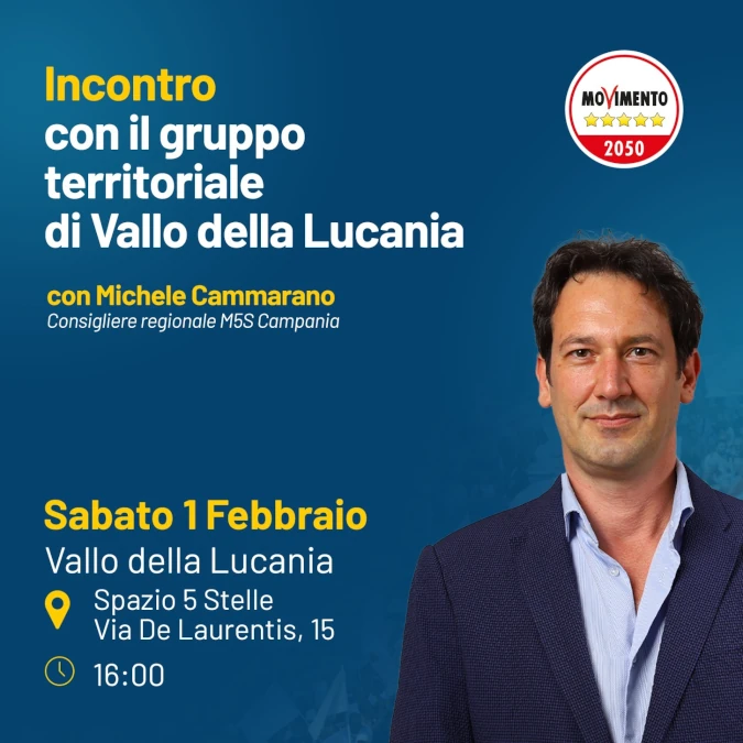Il Movimento 5 Stelle di Vallo della Lucania annuncia un importante appuntamento con il Consigliere regionale e Presidente della Commissione Aree Interne, Michele Cammarano. L’incontro si terrà sabato 1° febbraio alle ore 16:00 presso Spazio 5 Stelle Vallo della Lucania, in Via De Laurentis 15. Questo evento segna l’inizio di un percorso di ascolto e partecipazione attiva che vedrà, ogni 15 giorni, incontri dedicati alla raccolta delle istanze dei cittadini e alla preparazione per le elezioni regionali del prossimo autunno.