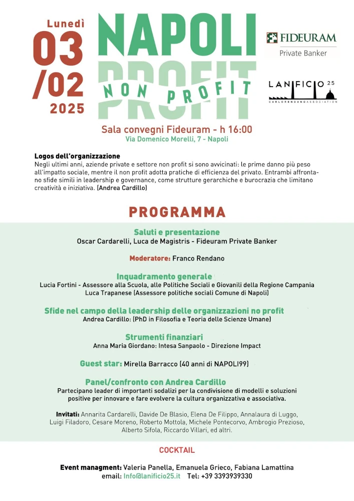 L’evento organizzato da Lanificio25 e dai private banker di Fideuram è una prima occasione per creare una rete di connessioni e sinergie fra profit e non profit in città che troppo spesso sono distanti e isolati. L’obiettivo è comprendere come questa interazione possa creare risultati positivi ad entrambi e come tale lavoro comune possa impattare positivamente sulla società e sul benessere delle persone. All’iniziativa prenderanno parte i rappresentanti delle seguenti realtà: Fondazione Napoli Novantanove, NEA Napoli Europa Africa, Made in Cloister, Dedalus, Maestri di Strada, Fondazione Napoli est Ciro Colonna, Circolo del Remo e della Vela Italia, FAI Campania, Est(ra)Moenia, Friends of Naples, Città della Scienza e Circolo Tennis Villa.