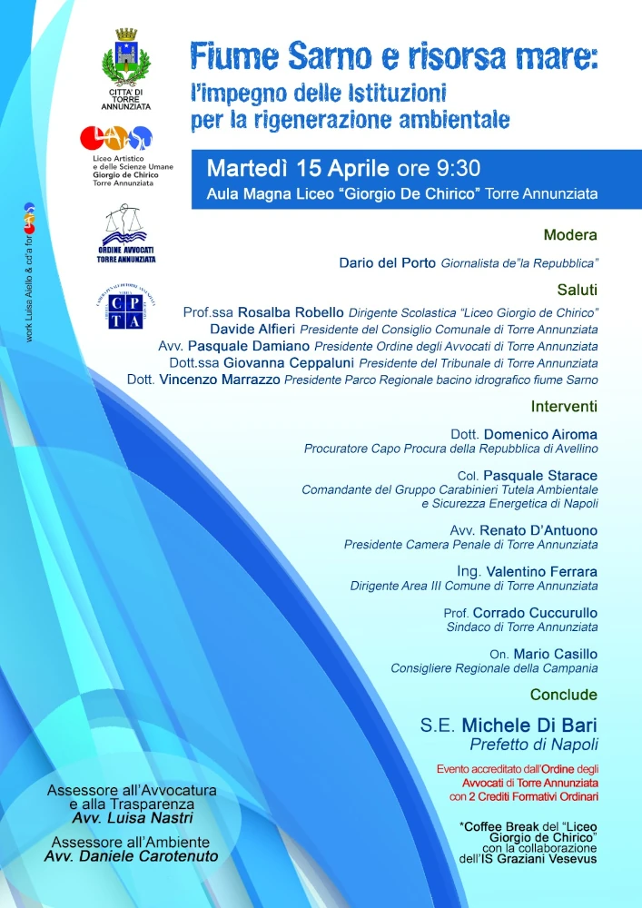 Il convegno sarà introdotto dai saluti della Dirigente Scolastica Rosalba Robello e a seguire Davide Alfieri, Presidente del Consiglio Comunale di Torre Annunziata, l’avv. Pasquale Damiano, Presidente dell’Ordine degli Avvocati di Torre Annunziata, Giovanna Ceppaluni, Presidente del Tribunale e Vincenzo Marrazzo, Presidente del Parco Regionale del bacino idrografico del fiume Sarno.