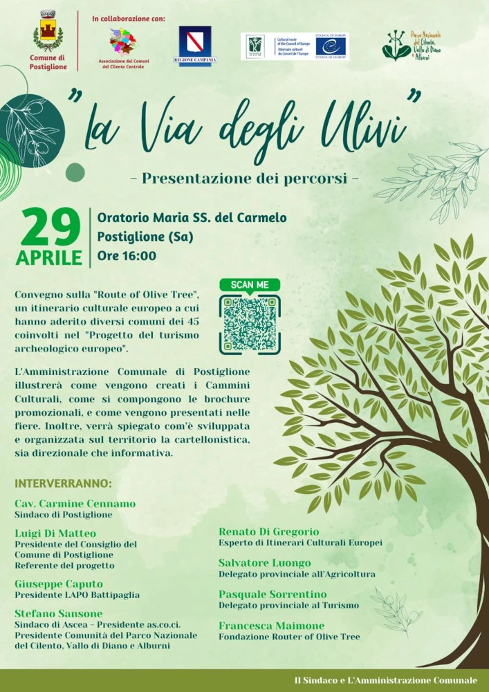 Così il sindaco del Comune di Postiglione, Carmine Cennamo, annuncia la presentazione del progetto europeo dei percorsi de “La Via degli Ulivi” che si terrà martedì 29 aprile 2025 a partire dalle ore 16 presso l’oratorio parrocchiale Maria Santissima del Carmelo di Postiglione.