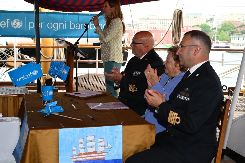 All’evento, che si è svolto in occasione della tappa a Napoli del Tour Mediterraneo Vespucci, hanno partecipato: l’Ammiraglio Ispettore Pierpaolo Budri, Capo di Stato Maggiore del Comando Logistico della Marina Militare,il Capitano di Vascello Giuseppe Lai Comandante di Nave Amerigo Vespucci, e per l’UNICEF Italia: la Presidente nazionale Carmela Pace, il Direttore generale Paolo Rozera, il Magistrato Nicola Graziano Membro del Consiglio Direttivo dell’UNICEF Italia e la Presidente del Comitato UNICEF Campania Emilia Narciso.