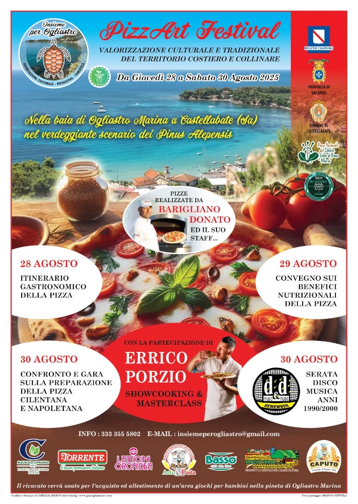 È la terza edizione di “Pizza Art Festival”, l’iniziativa gastronomica organizzata dall’associazione “Insieme per Ogliastro” con il main sponsor “Maurizio Cipriano”, e con i patrocini di Regione Campania, Provincia di Salerno, Parco Nazionale del Cilento, Vallo di Diano e Alburni, Comune di Castellabate e del Forum delle Associazioni di Castellabate.