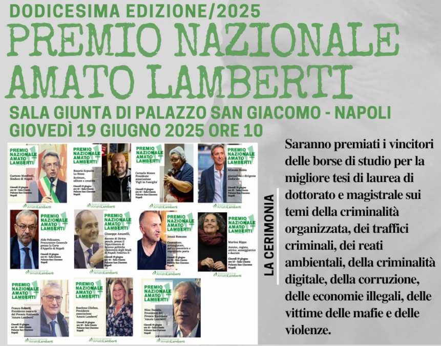 Giovedì 19 giugno 2025 alle ore 10 presso la Sala Giunta di Palazzo San Giacomo nell’ambito della dodicesima edizione del Premio Nazionale ‘Amato Lamberti’ saranno consegnate tre borse di studio ai vincitori per tesi di Laurea Magistrale e per tesi di Dottorato che riguardano i temi della criminalità organizzata, dei traffici criminali, dei reati ambientali, della corruzione e delle economie illegali, delle vittime delle mafie e delle violenze.