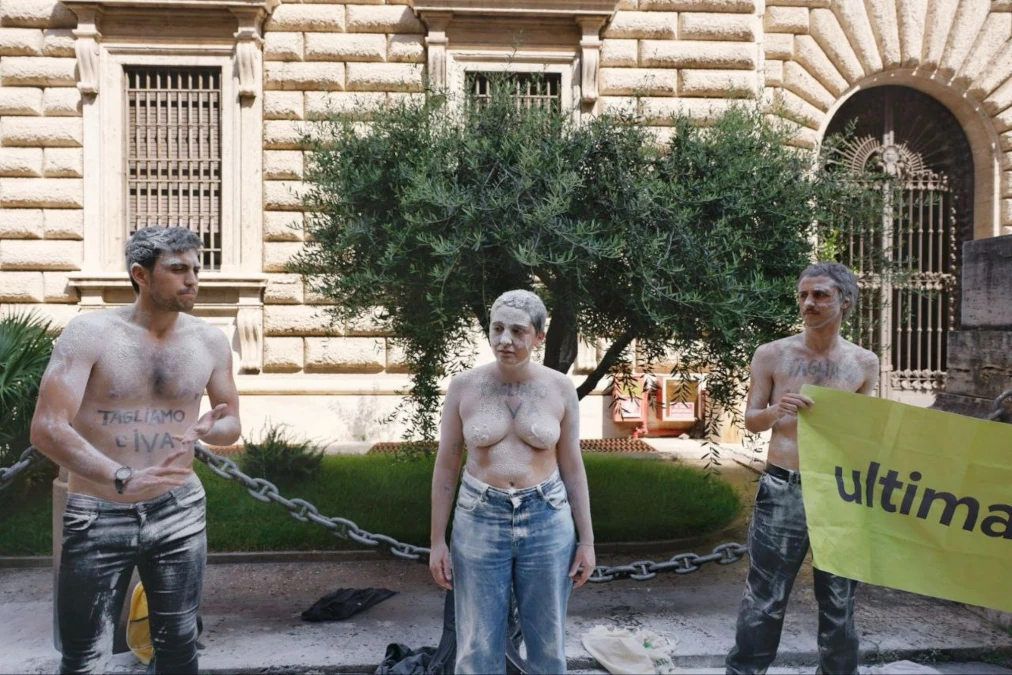 10 giugno 2025 – Questa mattina, intorno alle ore 10.00, davanti al Ministero dell’Agricoltura, in via XX Settembre, sette persone di Ultima Generazione, aderenti alla campagna “Il Giusto Prezzo”, hanno inscenato un’azione di forte impatto visivo e simbolico per denunciare l’inazione del governo. A petto nudo, con la scritta “Tagliamo l’IVA” dipinta sul corpo e reggendo un cartonato con una forbice gigante, si sono riversate addosso sacchi di farina bianca. Il bianco, colore della sottrazione, dell’assenza e dell’inerzia, ha riempito l’aria come a denunciare il silenzio complice e l’immobilismo del governo Meloni.