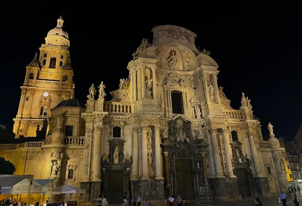 Origini miste, culture diverse e stili sovrapposti sono visibili nei luoghi e monumenti simbolo della città. In Plaza del Cardenal Belluga, la Cattedrale di S. Maria, dagli interni gotici e la facciata barocca è “piantonata” dallo svettante campanile di 95 metri (per altezza secondo solo alla Giralda di Siviglia) che rappresenta un raffinato segnalatore acustico, in grado di allertare i cittadini, utilizzando i differenti suoni delle 25 campane.
