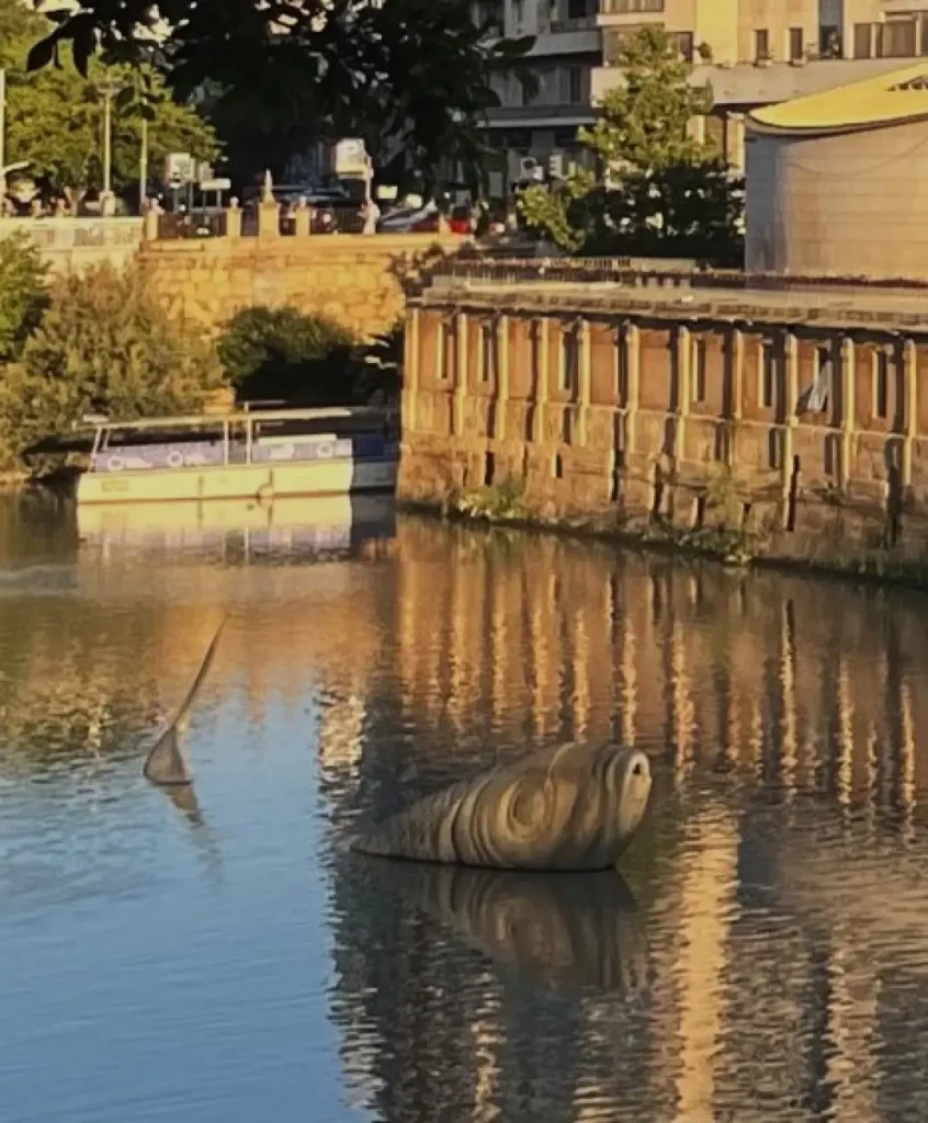 Le annuali “esequie” sul rogo, non impediscono al simpatico pesciolino, divenuto scultura di pietra dalle dimensioni aumentate, di far capolino dalla superficie dell’ acqua, quasi a tentare un fantasioso guizzo per saltar dal fiume.