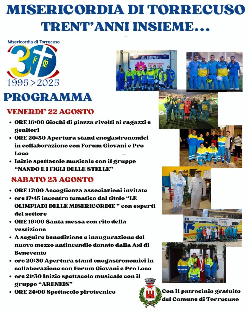 Proseguono senza sosta i preparativi per il grande evento che coinvolgerà tutta Torrecuso: parliamo del trentennale della Misericordia che si festeggerà il 22 e 23 agosto. Nasceva nell’agosto del 1995 la Misericordia di Torrecuso, secolare sodalizio di volontariato, che affonda le sue radici nella tradizione della prima Misericordia nata a Firenze nell’anno 1244.