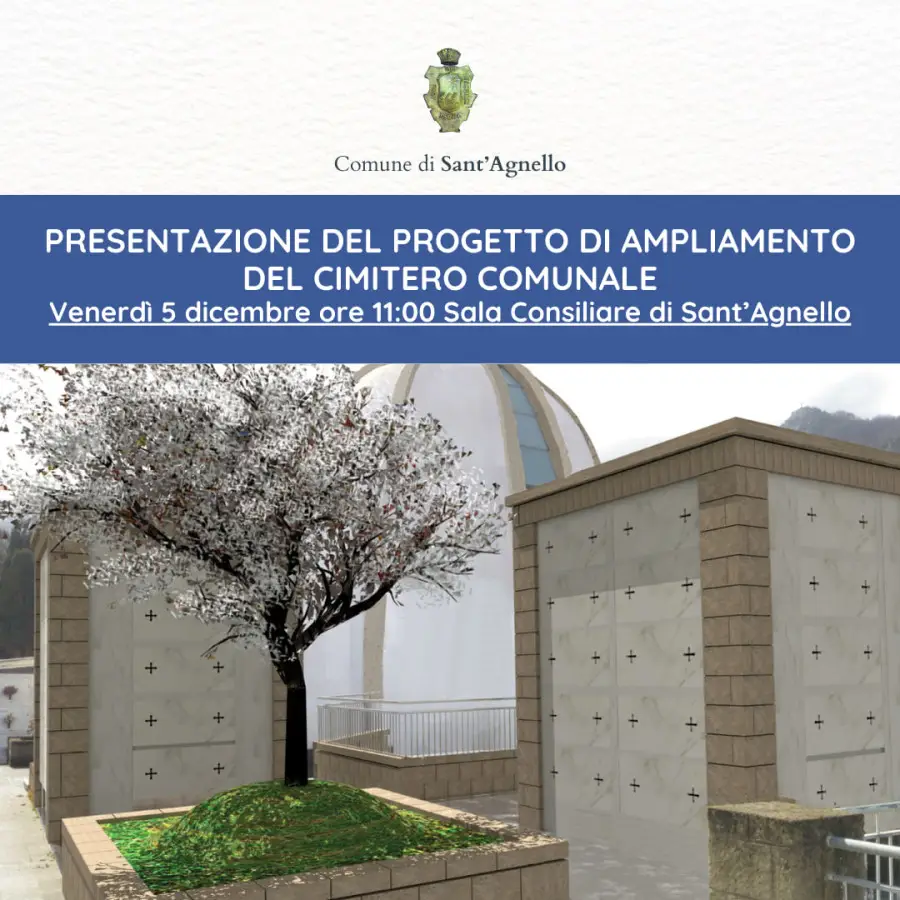 Venerdì 5 dicembre alle ore 11:00 presso la Sala Consiliare del Comune di Sant’Agnello verrà presentato il progetto di ampliamento del cimitero comunale. Il Sindaco Antonino Coppola, l’Assessore ai Servizi Cimiteriali Corrado Fattorusso, insieme agli Uffici comunali e al progettista, l’Architetto Livio Balsamo, illustreranno, con slide digitali e plastici, i lavori approvati e l’operazione autofinanziata.