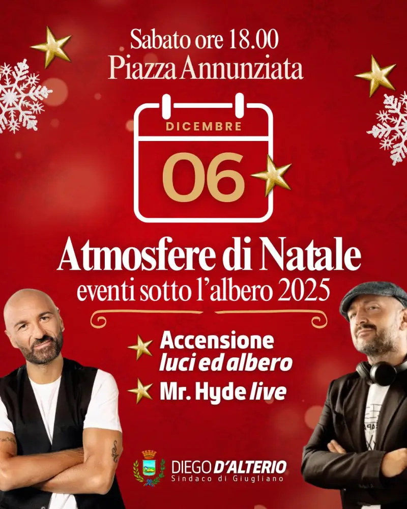 “Atmosfere di Natale – Eventi sotto l’albero 2025”: a Giugliano in Campania il più ricco programma mai organizzato, con la presenza di Mr. Hyde e Ciro Ceruti