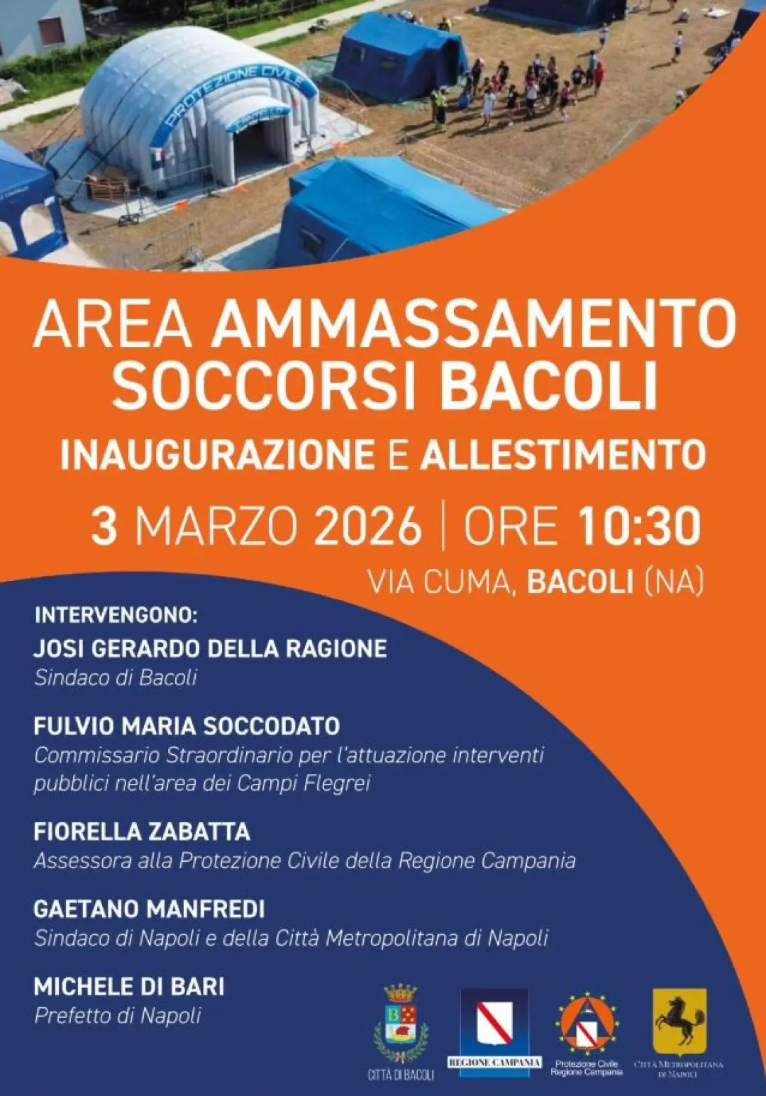 Si terrà domani, alle ore 10.30 a Bacoli (via Cuma), alla presenza del Sindaco della Città Metropolitana di Napoli, Gaetano Manfredi, dell’Assessora alla Protezione Civile della Regione Campania, Fiorella Zabatta, del Sindaco di Bacoli, Josi Gerardo Della Ragione, del commissario Straordinario per l’attuazione degli interventi pubblici nell’area dei Campi Flegrei, Fulvio Maria Soccodato, e del Prefetto di Napoli, Michele di Bari, l’inaugurazione dell’area Ammassamento soccorsi utile come presidio di protezione civile nell’ambito delle emergenze del territorio.