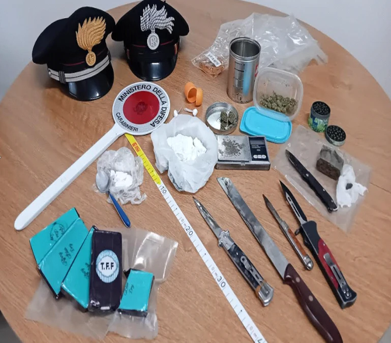 Presso l’abitazione del 24enne, i militari hanno rinvenuto circa 12 grammi di cocaina contenuti in un bicchiere di plastica, un bilancino di precisione con tracce della medesima sostanza, circa 5 grammi di marijuana custoditi in un barattolo in plastica, un coltello da cucina con tracce di hashish sulla lama, un cucchiaino con residui di cocaina e un ulteriore frammento di hashish del peso di circa 0,2 grammi. È stata altresì sequestrata la somma in contanti pari a 1.800 euro, ritenuta provento dell’attività di spaccio.