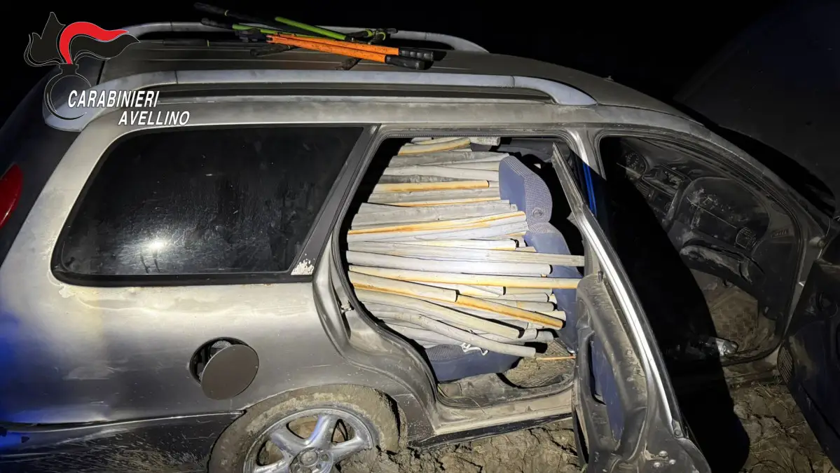 Alta Irpinia, intercettata auto sospetta con cavi in rame e attrezzi da scasso: tre individui fuggono nelle campagne, veicolo e materiale sequestrati dai Carabinieri.